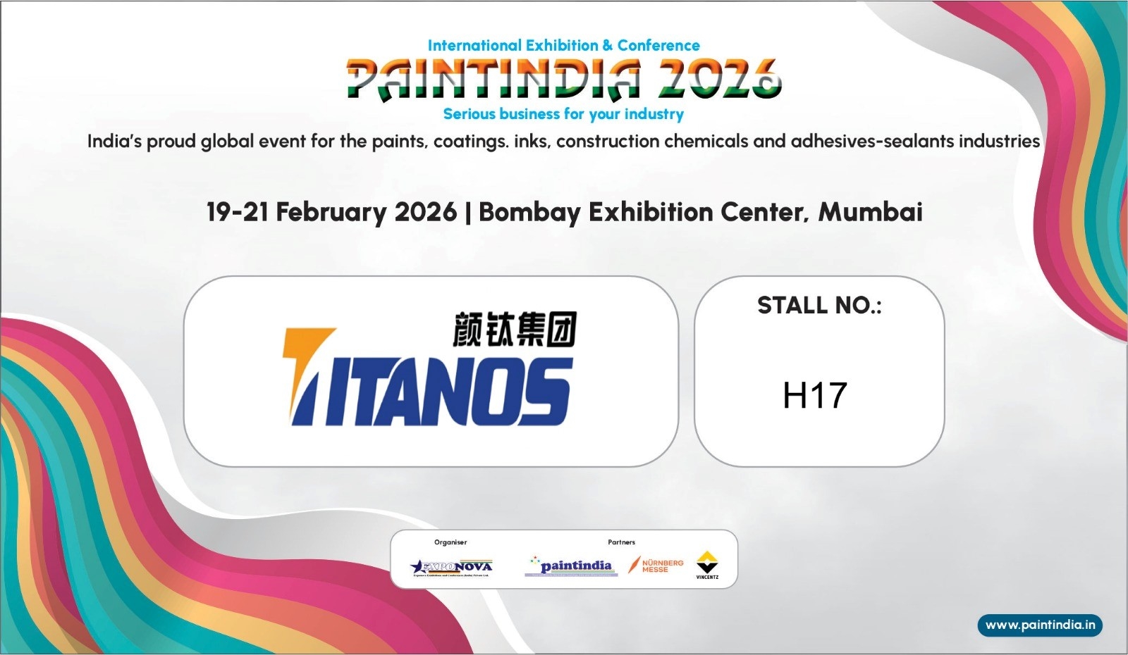 Titanos is going to attend the Paintindia 2026, taking place from 19 - 21 February 2026 in Mumbai, India. We warmly invite you to visit our stall: H17 to discuss cooperation opportunities and learn more about how our titanium dioxide solutions can support your production needs and market growth.