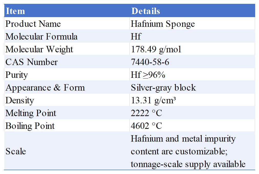 Hafnium Sponge appears as a silver-gray sponge-like structure with high melting point and stable chemical properties.