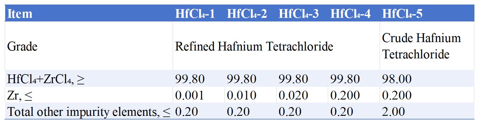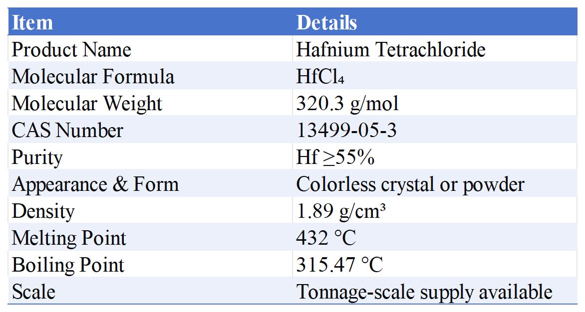 Hafnium Tetrachloride is an inorganic compound in the form of colorless crystals or powder. It reacts violently with water, has strong hygroscopicity, and is highly susceptible to hydrolysis.